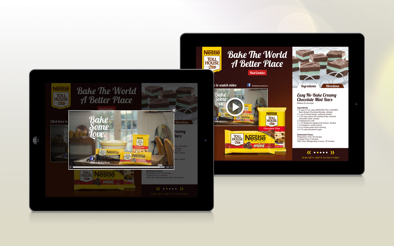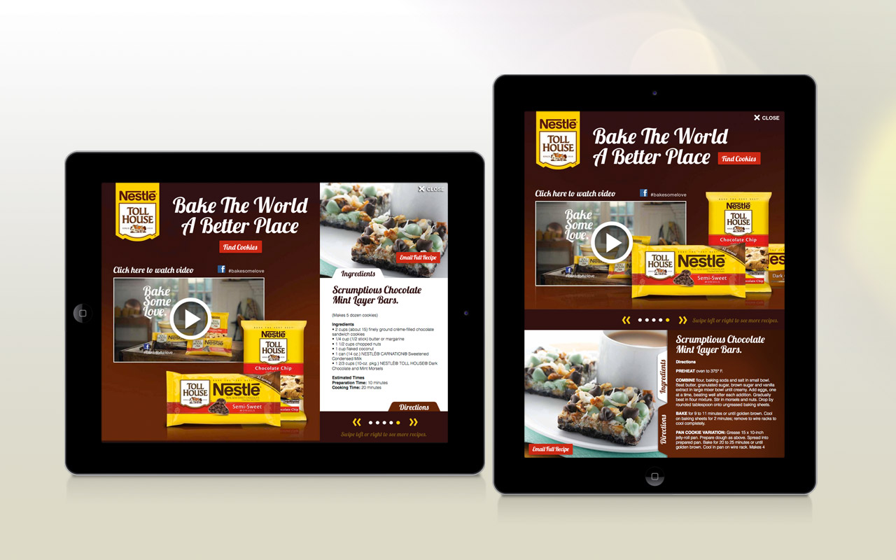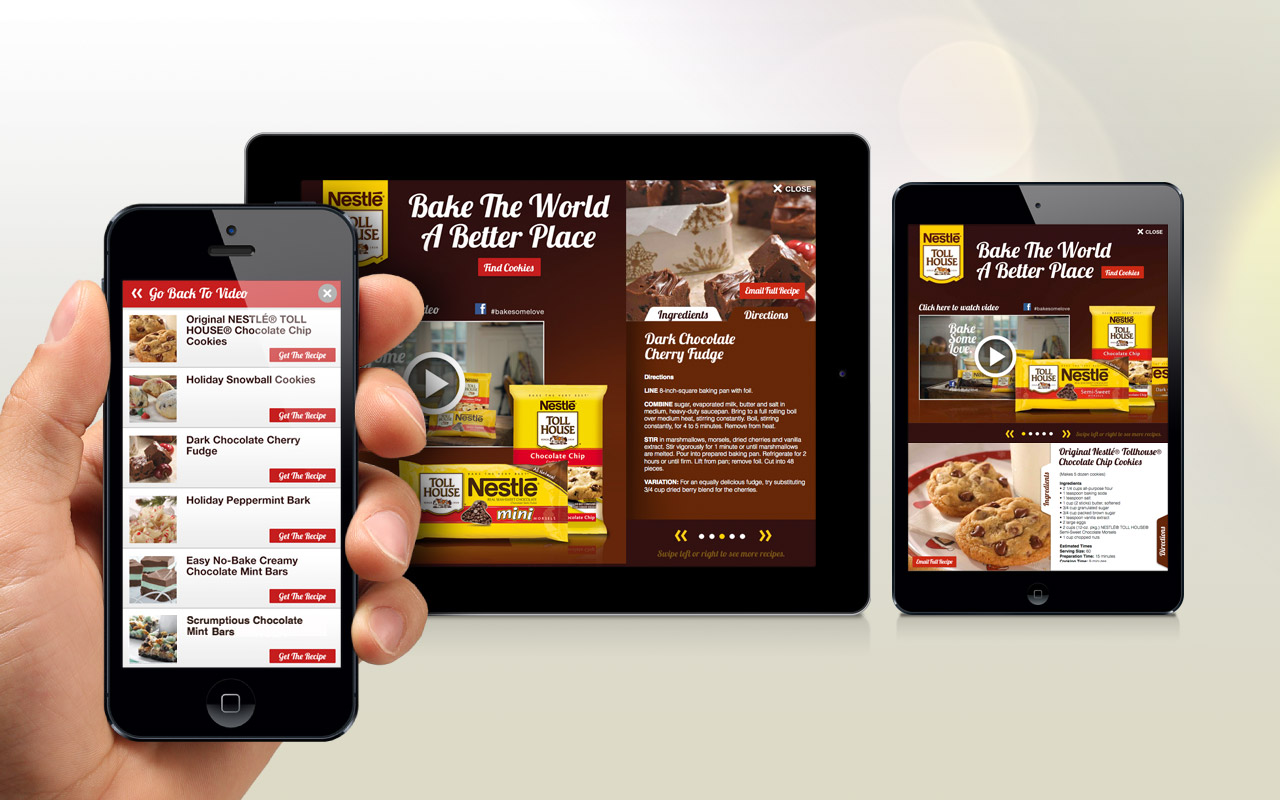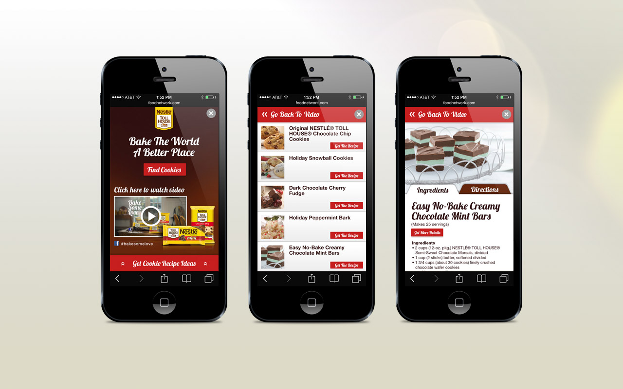 Implementing recipes and video supplied by Nestlé, we created an expandable mobile banner that had the potential to use the entire screen. This ad gave the user a large canvas with touch options, call-to-actions, and in-depth graphics. The user experience includes a full screen video and delicious recipes to choose from, plus email capabilities to send ingredients and directions to themselves or friends.
