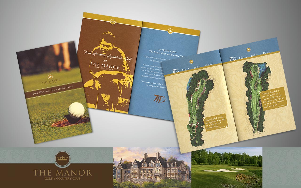 Partnering with Carroll/White, we created this logo identity for a new luxury real estate development in Milton GA, The Manor Golf & Country Club. Residents have membership access to the only Tom Watson-designed championship golf course in Georgia. The 5x7 booklet design highlights the 7,177-yard, par-72 course that offers the right balance of beauty, challenge and playability.