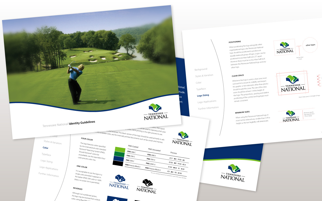 I created a brand style guide, with Tennessee National's new logo, to form and maintain all of those various elements that, when combined, spell out the entire brand as it's recognized. After designing business cards, envelopes, mail labels and note cards for marketing usage, the new logo started being applied to onsite signage and pro shop sale items.